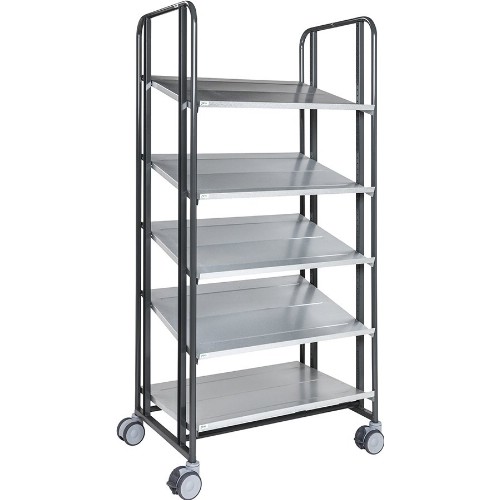 Flexibel backvagn med 5 plan som kan flyttas upp och ner samt vinklas. Hyllplanen kan monteras med kant upp eller ner. Pulverlackerad med elförzinkade hyllor. 2 st fasta och 2 st länkhjul med broms 100 mm, hjulbana av polyuretan. Som tillbehör finns extra hyllplan och praktiskt handtag. Levereras omonterad.
