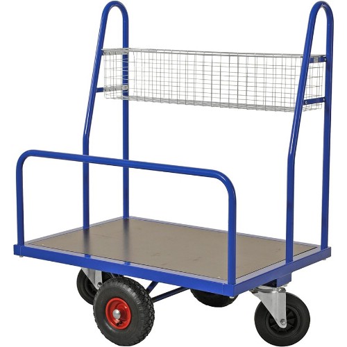 Stabil byggvaruvagn. Pulverlackerad. Elförzinkad trådkorg. 2 st 260 mm luftgummihjul och 2 st 200 mm länkhjul av massivt gummi.