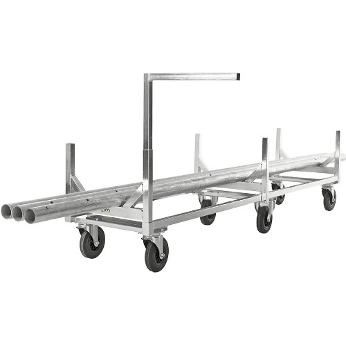 Robust långgodsvagn avsedd för stångmaterial och rör. Mycket lättmanövrerad även vid de riktigt tunga lasterna. Utrustad med lasthållare och 1 st handtag. Elförzinkad. 2 st fasta, 4 st länkhjul 200 mm av massivt gummi. Levereras omonterad.
