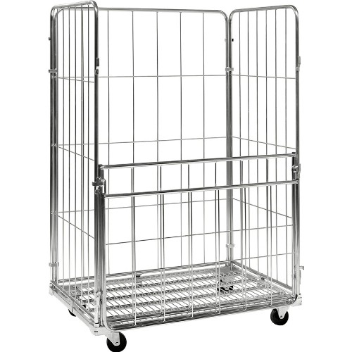 Rullcontainer med 4 nätsidor. 1 halvhängd grind på ena långsidan, som går att fälla eller ta bort helt. Elförzinkad. Enkel montering utan verktyg. 2 st fasta och 2 st länkhjul 100 mm av nylon. Levereras omonterad.