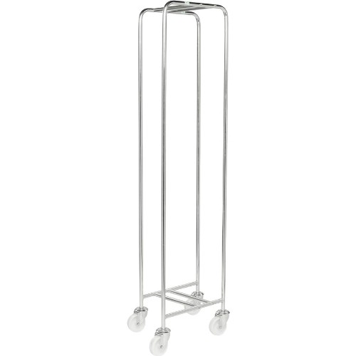 Trallvagn för enkel förvaring och transport av trallor. Elförzinkad. Plats för 10 st trallor av storlek 600x400 mm. 4 st 100 mm länkhjul av nylon. Levereras omonterad.