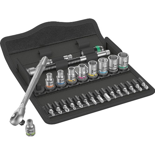 Komplett hylsnyckelsats i 28 delar med spärrnyckel, 6-kant hylsor, förlängare och bits. Finns i två utföranden – Med spärrnyckel Zyklop Metal 8003, med genomtrycks-funktion för ändring av riktning eller med spärrnyckel Zyklop Metal 8004, med omkopplingsspak för ändring av riktning. Båda modellerna med säker låsning av hylsan och låg returvinkel.