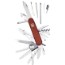 Stort knivblad, litet knivblad, korkskruv, konservburksöppnare, liten skruvmejsel, kapsylöppnare, stor skruvmejsel, kabelskalare, syl, nyckelring, pincett, tandpetare, sax, flerfunktionskrok, träsåg, fiskfjällare, kroklossare, linjal (cm + tum), nagelfil, metallfil, nagelpetare, metallsåg, skruvmejsel 2,5 mm, stämjärn, tång med hylspress, vajeravbitare, skruvmejsel Phillips, förstoringsglas, kulspetspenna, rak spets, skruvmejsel mini, och trådöga.