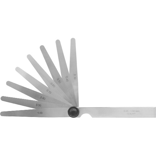 Fjäderhårda stålblad/slitsmått i konisk form med tydlig märkning av tjocklek. Förnicklad hållare med ledad nit som är låsbar.