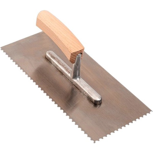 Tandspackel av stål. Tandad på en lång- och en kortsida. Olackat trähandtag för bättre grepp. Avsedd för fix vid plattsättning. Rundad tandning.