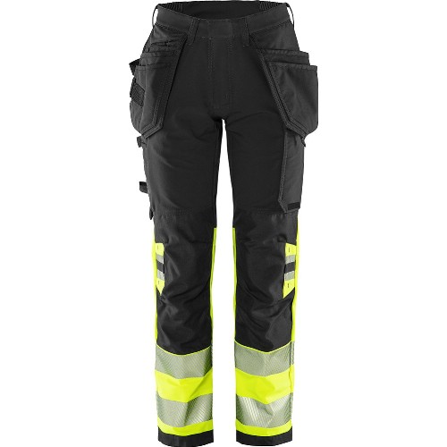 Miljödeklarerad varselbyxa för dam i hantverksmodell tillverkad i 4-vägsstretch av biobaserade och återvunna material och utrustad med stretchpaneler i midjan. Slitstarkt ripstop-material med 4-vägsstretch på stuss och baksida lår. Förstärkt i utsatta partier för extra slitstyrka. 2 löst hängande Cordura-förstärkta spikfickor, den ena med ficka med dragkedja, 3 mindre fickor och verktygshällor, den andra med extra ficka. D-ring under spikfickan. 2 framfickor. 2 bakfickor med lös botten, varav en med dragkedja. Cordura-förstärkt tumstocksficka med verktygsficka, pennficka samt knapp och hälla för kniv. Benficka med tryckknapp, ficka med dragkedja och D-ring. Hammarhank. Dold knapp framtill. Ribbstickade stretchpartier i midjan. Dubbel förstärkt grensöm. Knäfickor i Cordura med öppning inifrån. Knäskydden i knäfickorna kan höjdjusteras. Corudra-förstärkt benslut. Dold kängkrok. Ingår i Fristads Green-kollektion. Hållbar och miljödeklarerad enligt EPD (Environmental Product Declaration). Tvätt 60°C.