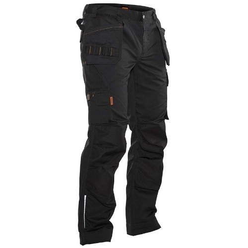 Lättskött hantverksbyxa som håller färg och form. Hölsterfickor med extra fack och extra ficka med blixtlås. Bakfickor med lock och kardborrestängning. Benficka med extrafack och lock med kardborrestängning. Tumstocksficka med knivhållare. Förstärkning i hölsterfickor och på knäskyddsfickor. C42-64 kan förlängas med 5 cm genom ett utvik i benslutet. Tvätt 60°C.