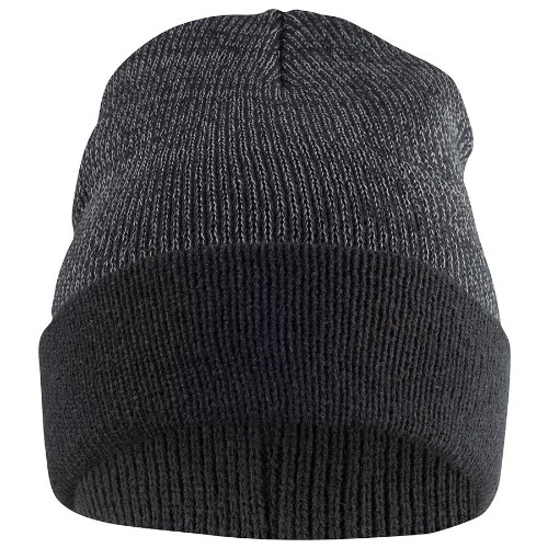 Stickad mössa med uppvik och instickad reflextråd. Tvätt 40°C.