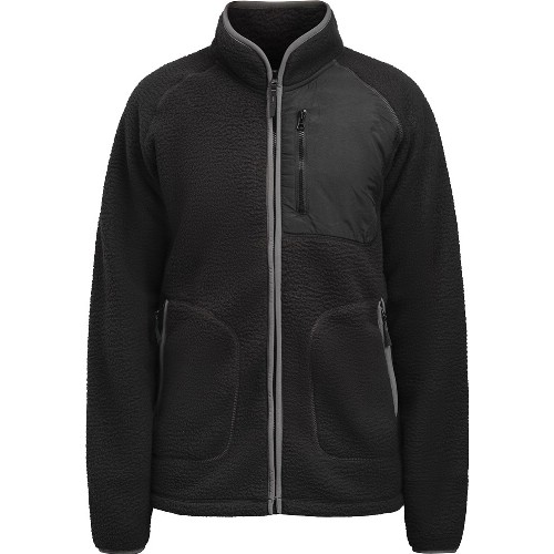 Pälsfiberjacka med partier av tyg vid armbågar och bröstficka. Bröstficka och sidfickor med blixtlås. Elastiskt kantband runt kragen och vid ärmavslut. Reglerbar i nederkant med dragsko. Tvätt 40°C.