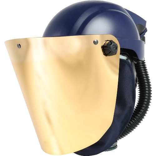 Skyddshjälm med visir avsedd att användas tillsammans med den batteridriven fläktenhet SR 500, SR 500 EX eller SR 700 och godkända filter ingår i Sundströms fläktassisterade andningsskyddssystem. Försedd med guldpläterad siktskiva (mörkhetsgrad EN 5) som används som ett värmeskydd då arbete utförs vid starka värmekällor. Belagt med ett tunt guldskikt, vilket medför att den kraftigt reducerar strålningsvärmen. Hjälmens andningsslang ansluts till den filterförsedda fläkten. Övertrycket i visiret förhindrar partiklar och andra föroreningar att komma in i andningszonen. Kan också användas tillsammans med trycklufttillsats SR 507. Denna kombination utgör en andningsapparat med kontinuerligt luftflöde för anslutning till tryckluft. Utrustningarna kan användas som alternativ till filterskydd i alla situationer där sådana rekommenderas. Detta gäller i synnerhet vid tunga, varma eller långvariga arbeten. Skyddar andningszonen och huvudet. Uppfällbart visir med PC siktskiva och visirram som klarar höghastighetspartiklar 120 m/s, vätskestänk och smält metallstänk. Den guldplätterade siktskivan monteras utanpå det uppfällbara visiret. Tillförd luft håller visiret imfritt. Reglerbar huvudställning. Utbytbar flexibel andningsslang. Försedd med utandningsventil. Utbytbara skyddsfolier finns som tillbehör. Standardfäste för hörselkåpor.