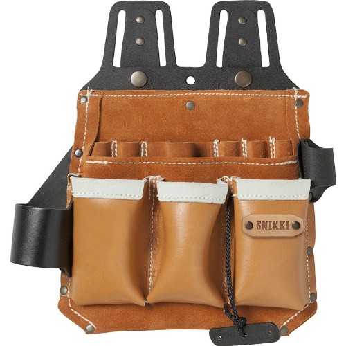 Elektrikerficka för installatörer, montörer m fl. För isolerade verktyg. Fem mejselfack, knivhållare, tejphållare. Fack för tumstock eller mindre skruvdragare. Stort fack för tänger, skalverktyg m.m. Tre fack för isolerade tänger, hammarhållare. Nitförstärkt. Quickgrip. Monteras på rem med bredd upp till 60 mm samt ergonomibälte.